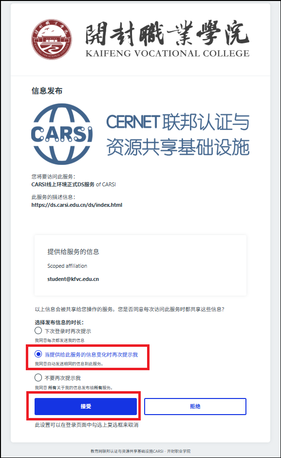 3.勾选“此服务的信息变化时再次提示我”后,点击“接受”。