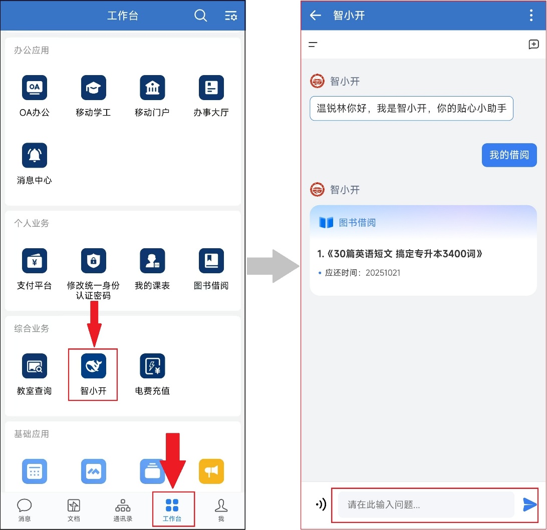 “智小开”AI智能助手已整合学工、教务、招生等多部门的高频咨询业务,目前已接入课表查询、借阅查询、成绩查询等核心实用功能。其知识库依托学校各部门制度文件、办事流程、操作手册及常见问答等材料构建,并实时更新,保障知识的时效性与准确性。不同于通用AI助手,“智小开”作为我校专属AI智能助手,能精准对接校内业务,为师生提供更具个性化、智能化的服务。