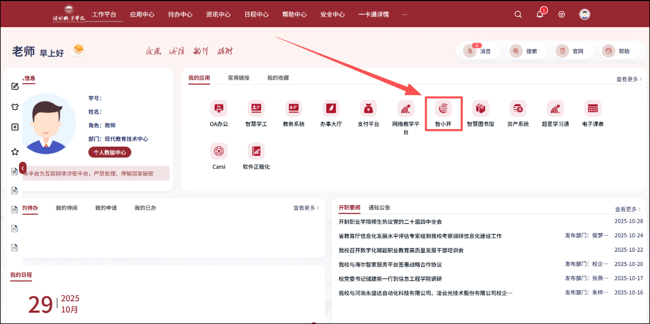 1.打开学校信息门户,在“我的应用”中点击“智小开”。