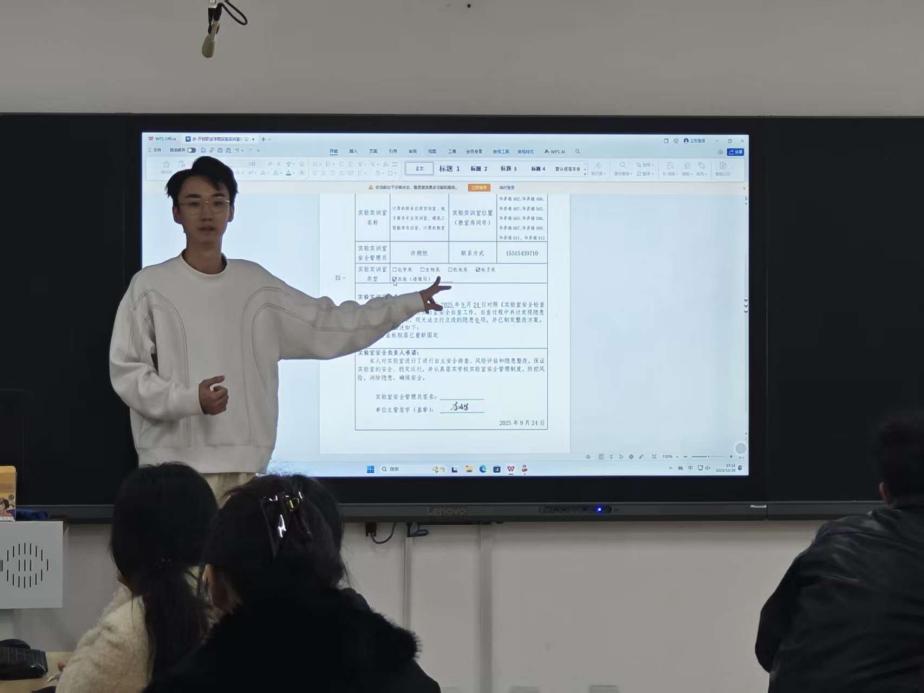 随后,许朔恺老师围绕《实验室安全手册》及月安全检查项目表的填写规范进行了逐项说明,并就实验室安全制度执行、隐患排查与整改要求进行了针对性指导。他从应急处置、现场管理和安全责任落实等方面进行了细致讲解,结合典型情况提醒管理员关注检查表中易被忽略的项目,进一步强化了制度执行、记录留痕和隐患整改意识。