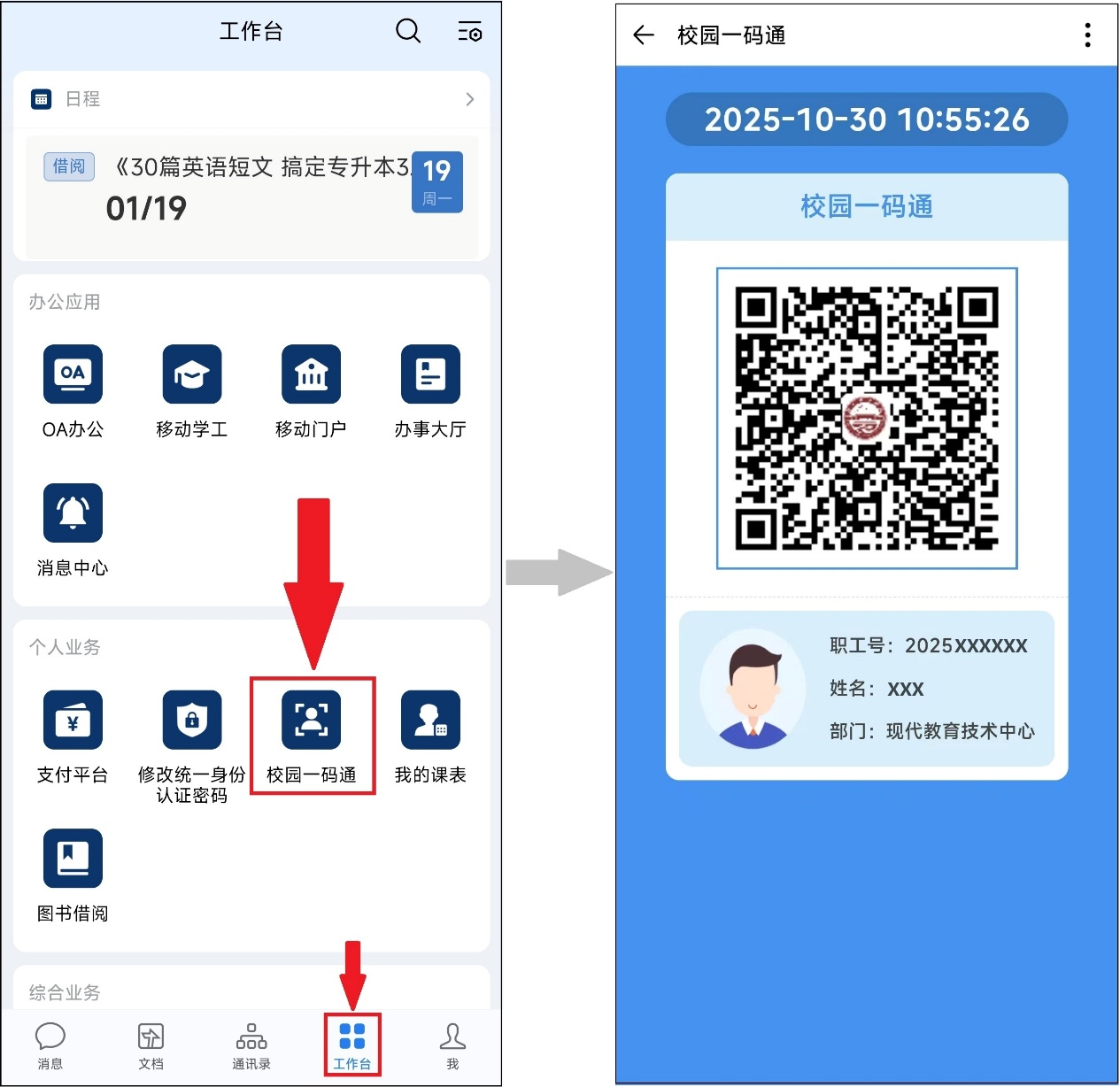 打开企业微信,依次点击“工作台—个人业务—校园一码通”,即可进入校园一码通界面,生成动态验证码。在图书馆借阅台出示二维码,即可进行图书借阅。