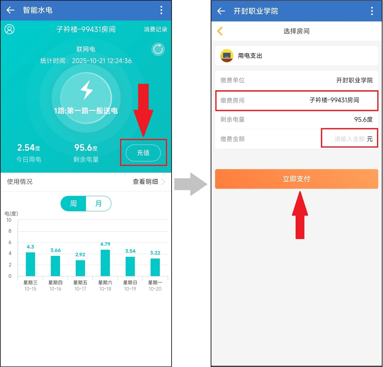 3.在电量详情界面点击充值按钮,跳转至房间选择界面,选定需缴费的房间并输入缴费金额,完成后续支付即可。