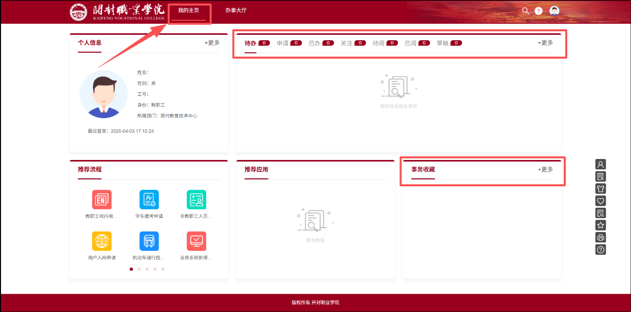 2.在网上办事大厅「我的主页」界面,个人信息区:可查看身份、部门、登录时间等,快速确认账号安全;待办/申请进度区:可一站式查看所有业务状态,实时掌握办事进度;推荐流程区:提供高频常用业务快捷入口,直接点击就能发起申请,不用翻找全量列表;事务收藏区:可收藏常用业务,下次一键直达,提升办事效率。