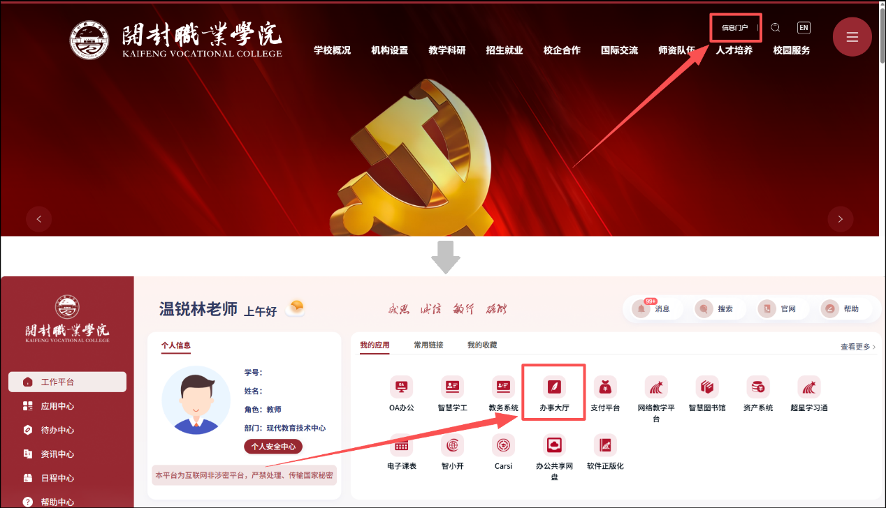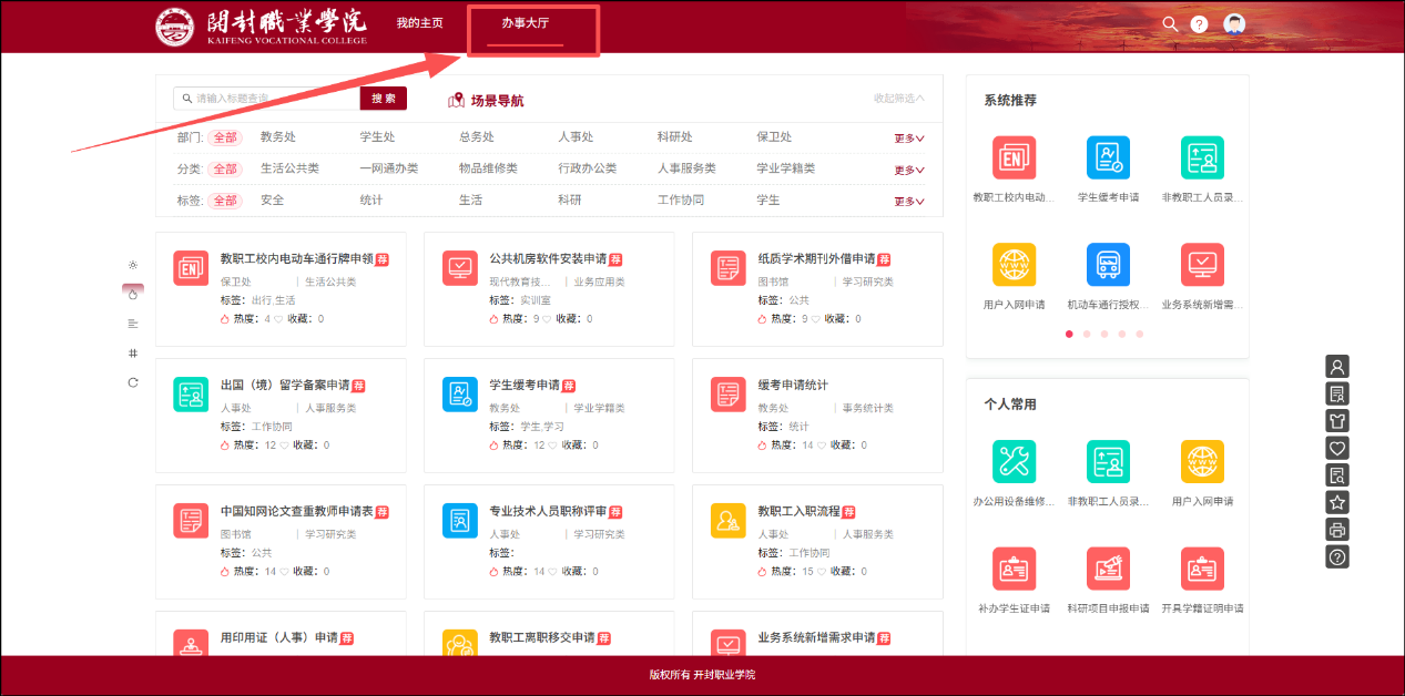 1.打开开封职业学院官网,右上角点击登录信息门户,找到“我的应用”板块,点击“网上办事大厅”,即可进入平台选择所需业务办理。